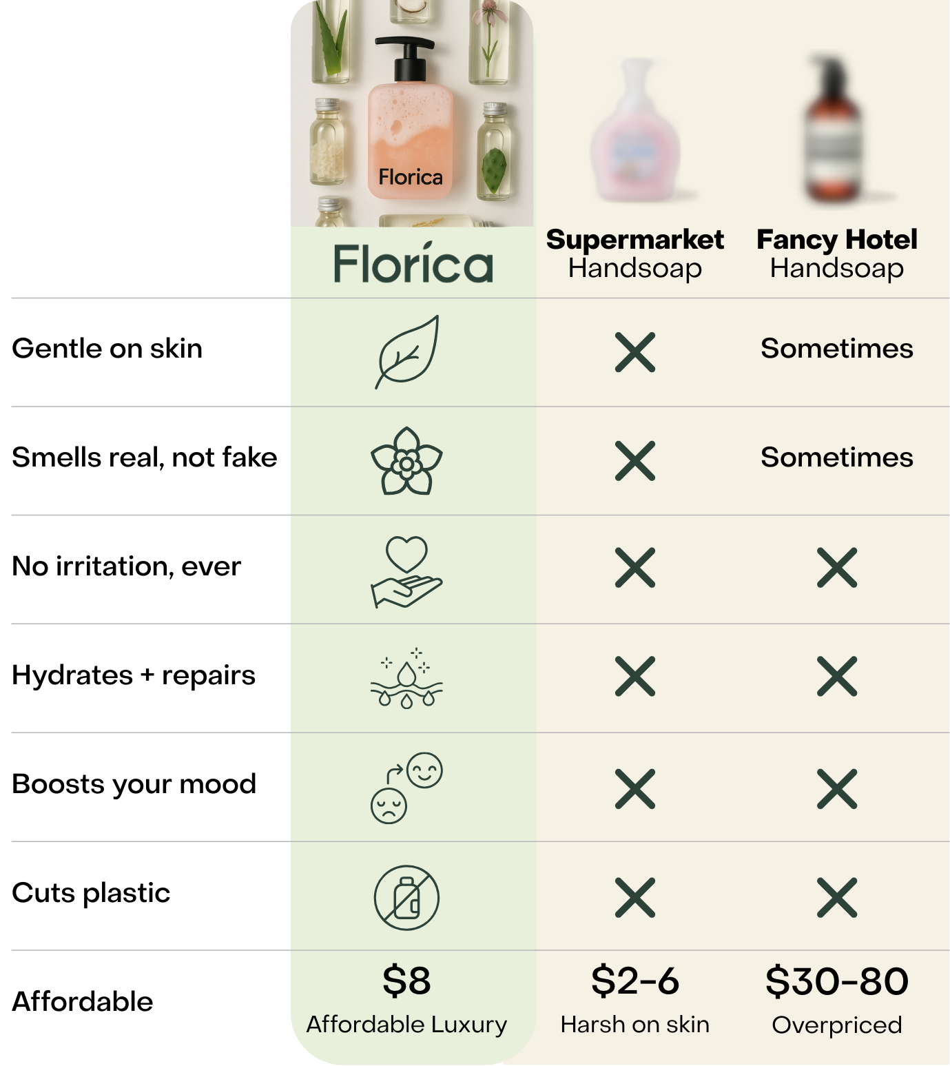 Florica contains no SLS and other harsh chemicals, which means it’s does not dry your hands and cause long term health issues. With added hyaluronic acid and ceramides, it helps keep all skin types, even sensitive ones healthy and hydrated.